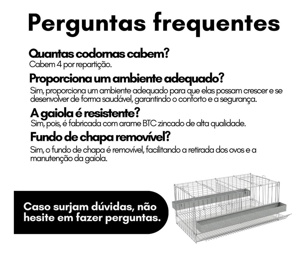 A Gaiola Poedeira Desmontável com Divisão é a solução ideal para a criação de codornas. Oferece um ambiente seguro e confortável, combinando durabilidade e praticidade para o seu manejo diário.