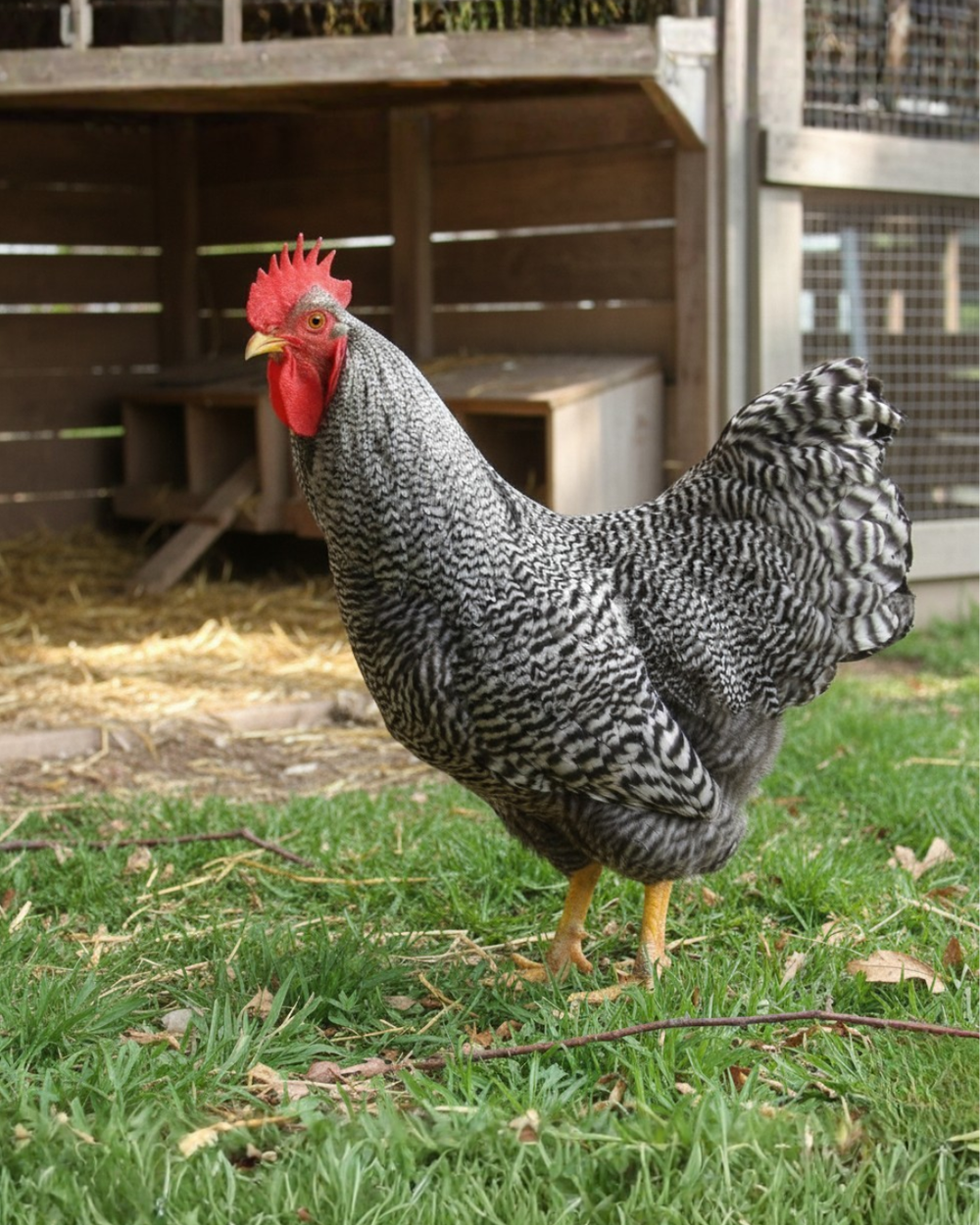 A Amrock é uma ave de grande porte, originária da Alemanha e aprimorada nos Estados Unidos, conhecida por sua pelagem carijó (barrado) distintiva e sua notável rusticidade. Além de sua aparência marcante, esta raça é muito apreciada pela qualidade da carne saborosa, tornando-a uma excelente escolha para produtores que buscam robustez e versatilidade.