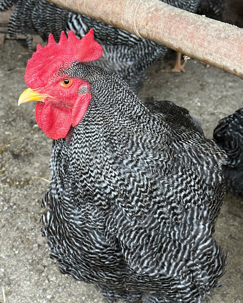 A Plymouth Rock Barrado é uma raça robusta e versátil, facilmente reconhecível por sua plumagem marcante em barras. Estas aves são apreciadas tanto pela sua boa produção de ovos quanto pela carne saborosa, sendo uma excelente escolha para criadores que buscam animais rústicos e de dupla aptidão.