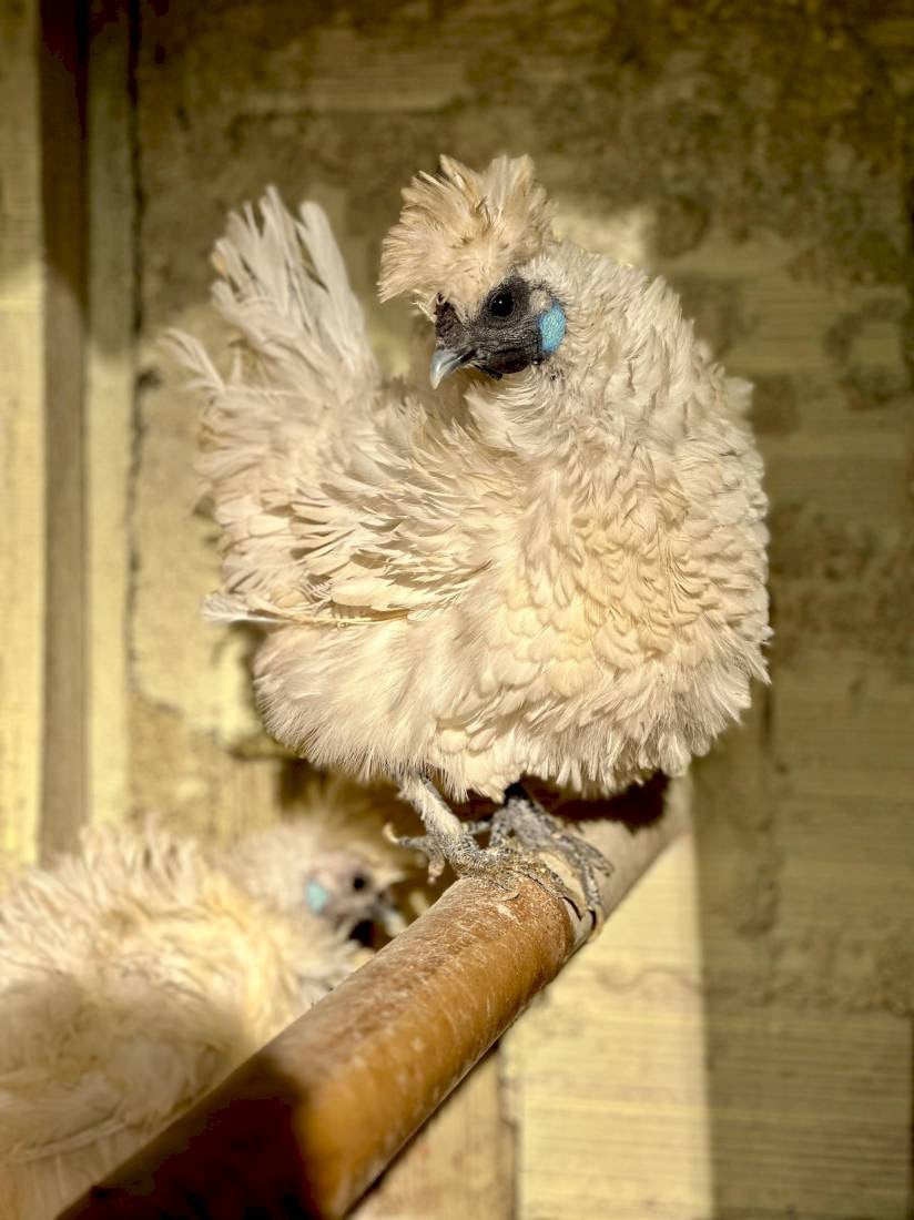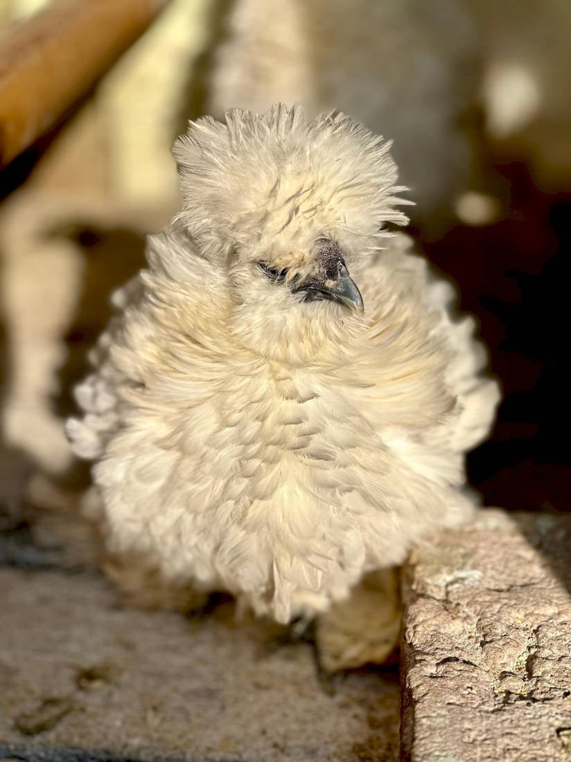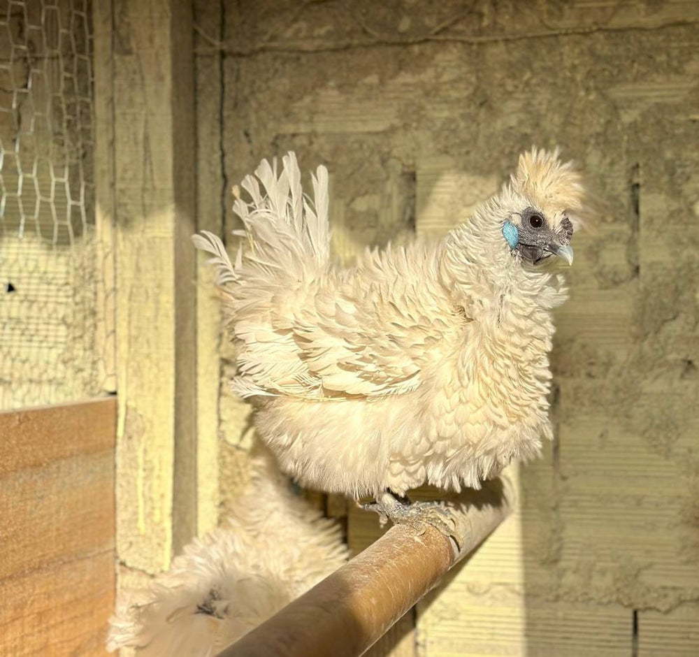 A Sedosa Branca Frisada é uma encantadora variação da tradicional galinha Sedosa do Japão, destacando-se por suas penas frisadas e encaracoladas, que lhe conferem uma aparência ainda mais fofa e volumosa. Esta raça se distingue por seu temperamento dócil e amigável, compartilhando as mesmas características físicas únicas das Silkies, como pele e ossos pretos, lobos das orelhas azuis e cinco dedos em cada pé.