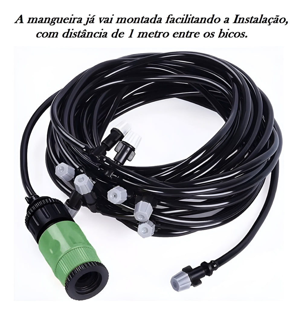 Transforme seu espaço com o nosso Sistema de Neblina completo. Ideal para climatização, refrigeração e irrigação, este kit de 10 metros com 10 bicos dispersa uma névoa fina que refresca o ambiente para sua família e pets, além de ajudar a repelir insetos voadores.