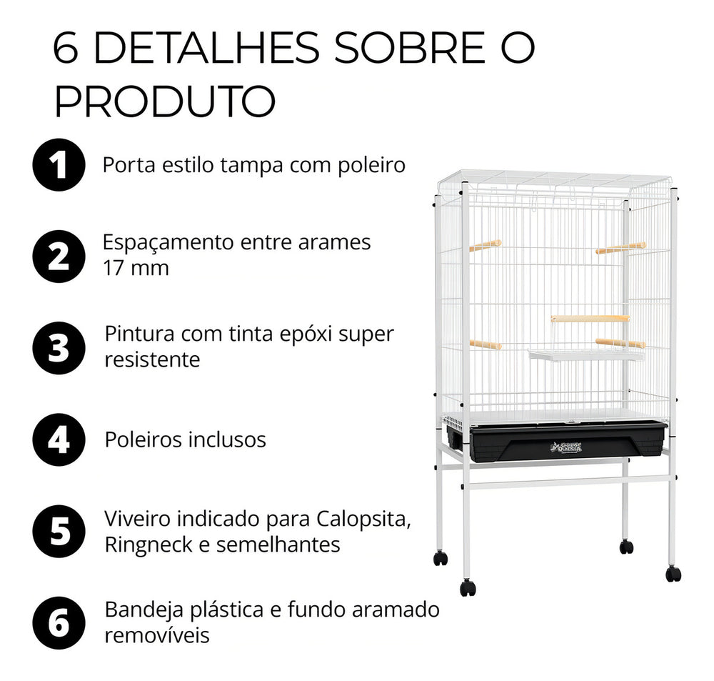 Garanta o bem-estar e a segurança de suas calopsitas, ring necks e papagaios com nosso viveiro espaçoso e confortável. Projetado para oferecer liberdade e diversão, é o lar ideal para aves de médio porte.